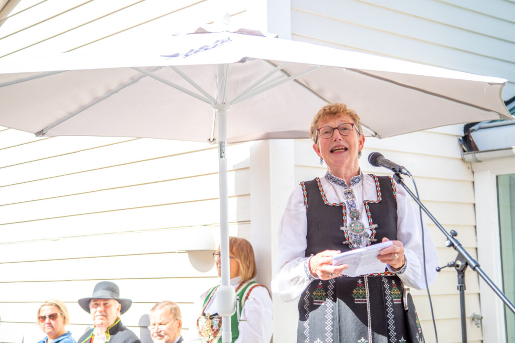 TALA: Solvor Aadland feira at det er 211 år sidan 112 menn samla seg på Eidsvoll for å skriva under grunnlova. – Dei blei einige om at Noreg skal vera eit fritt og fredeleg land, «enige og tro inntil Dovre faller», seier Solvor. FOTO: Siri Ravn