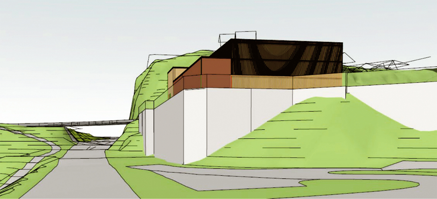 SPENTE PÅ PRISEN: Eitt av elementa som kan få stor innverknad på kostnaden med å byggja ny brannstasjon, er den høge muren som må reisast mot Fv49. FOTO: Skisse ABO